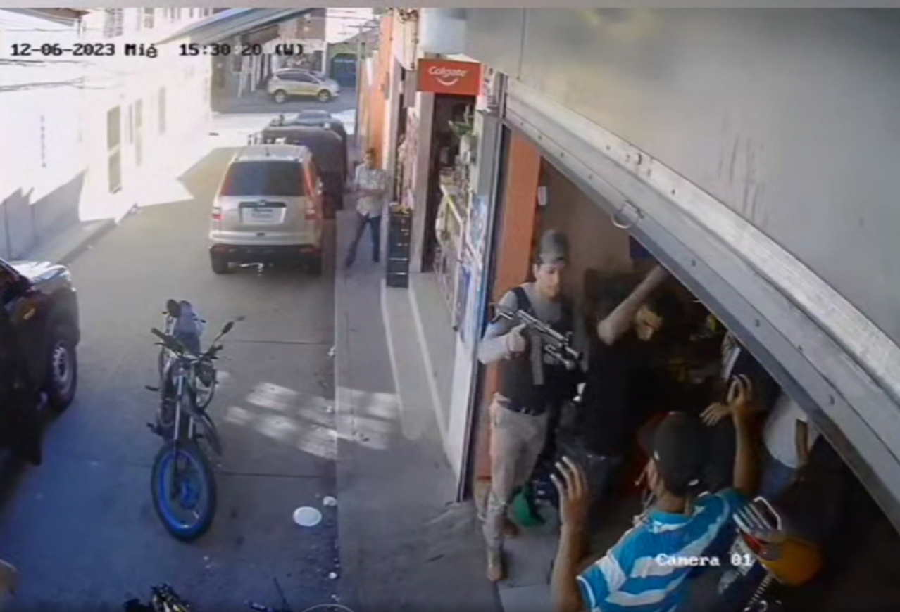 En las imágenes captadas por cámaras de seguridad muestran a los asaltantes bajarse con armas de grueso calibre de un vehículo pick-up color negro.