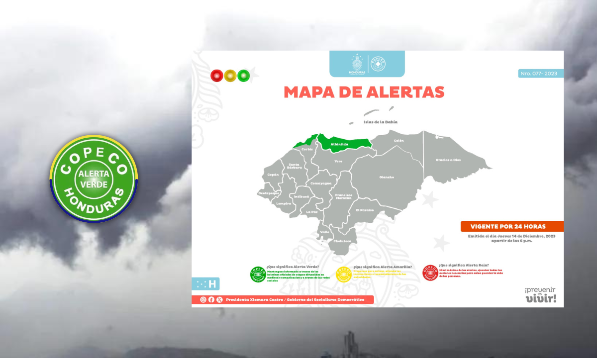 La Secretaría de Estado en los Despachos de Gestión de Riesgos y Contingencias Nacionales, deja en alerta verde al departamento de Atlántida y al municipio de Omoa, en el departamento de Cortés, por un período de 24 horas a partir de las 6 de la tarde de hoy jueves 14 de diciembre del 2023.