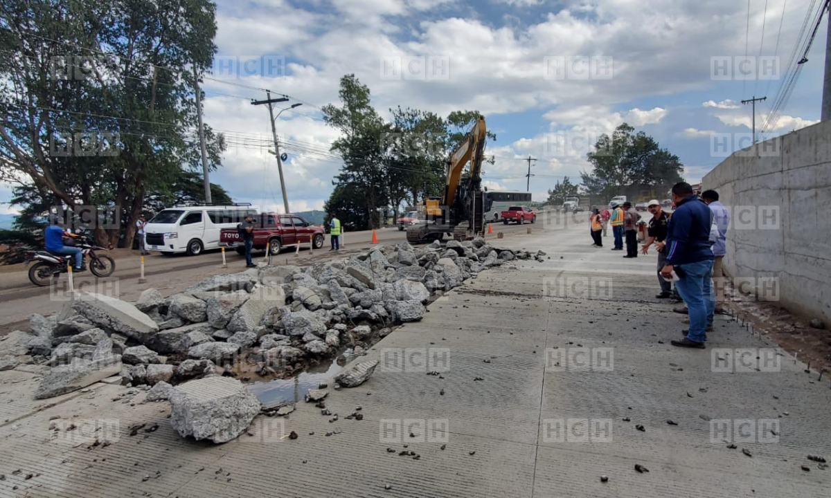 Maquinaria pesada está haciendo los trabajos de remoción del concreto hidráulico para reparar la tubería soterrada que da el servicio de agua a los locales de esta carretera.