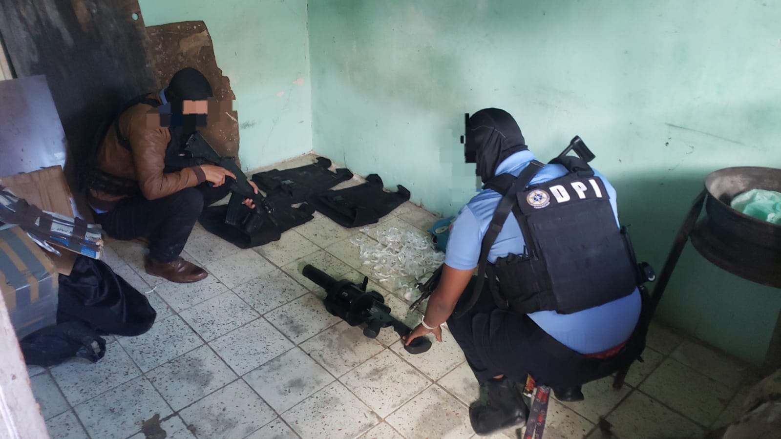 Durante el operativo, agentes asignados al Departamento de Delitos Contra la Propiedad (DDCP) de la DPI, lograron decomisar armamento de guerra y material ilícito, entre ellos se encontró un lanzagranadas, chalecos antibalas y droga.
