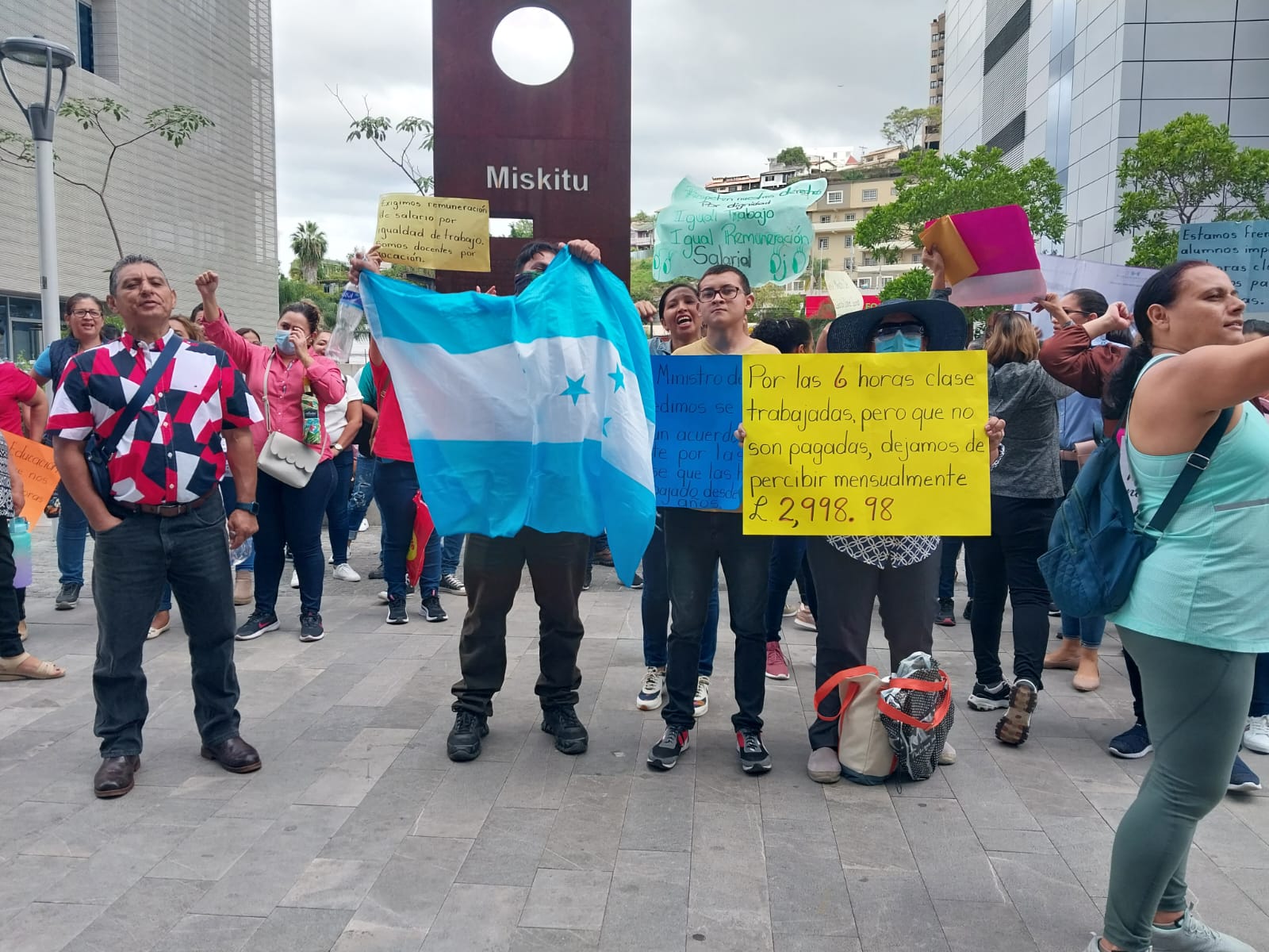 Con pancartas en mano, los docentes solicitan al ministro de Educación Daniel Esponda que se les atienda y se les haga efectivo de las horas que se les adeudan de su salario.