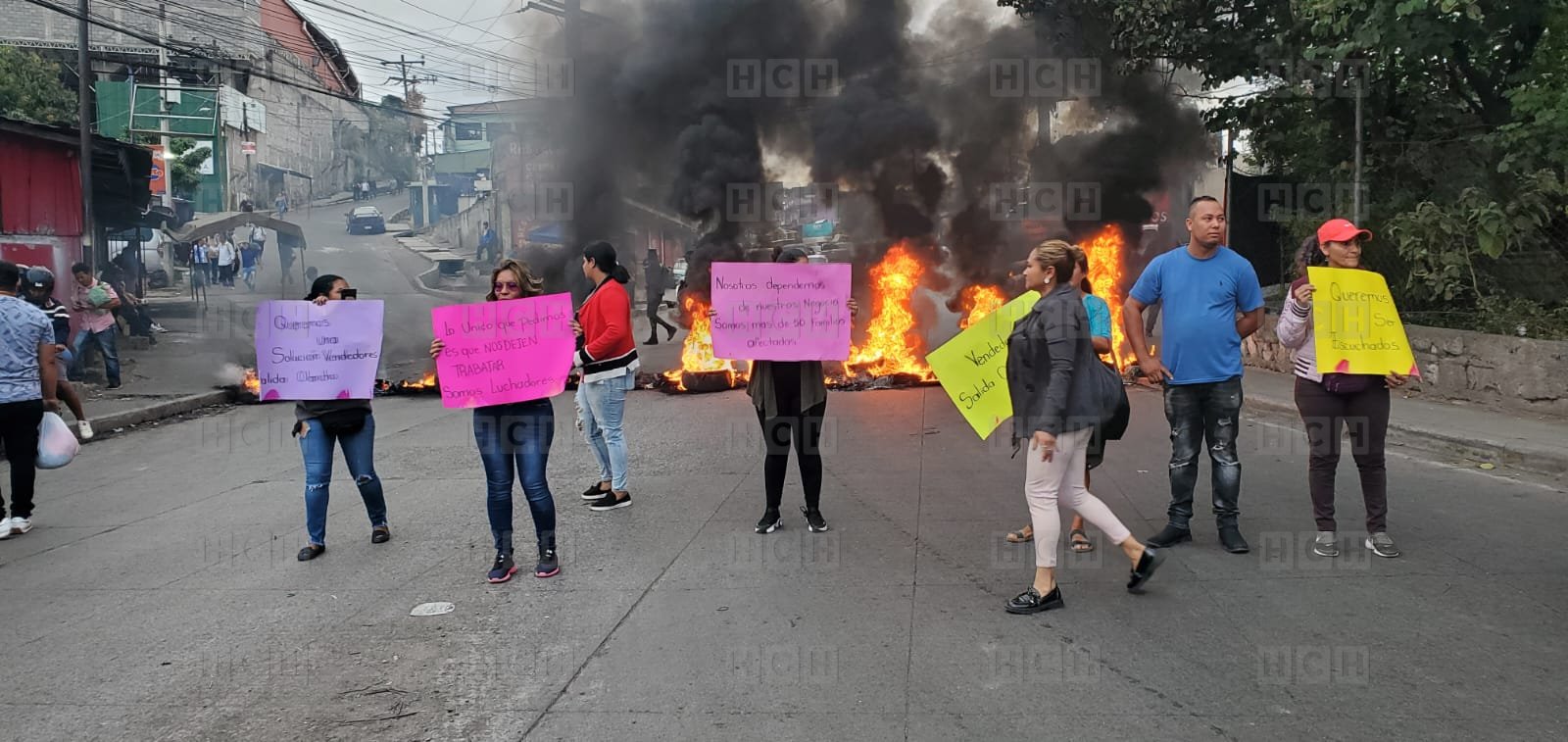 Vendedores apostados a la orilla de la carretera a Olancho protestan con quema de llantas en oposición a su desalojo para la construcción de cuatro carriles en la zona.