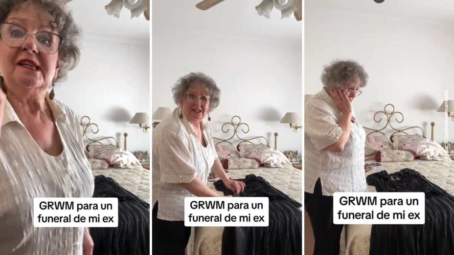 “Voy a hacer un ‘Get Ready With Me’ para el funeral de algunos de mis ex… es una poshera, plisada, divina de gasa, preciosa con éste conjuntito que también tiene unos voladitos de gasa y estos aretes que tienen ésta bolita negra para el funeral”, dice la abuelita en su video.