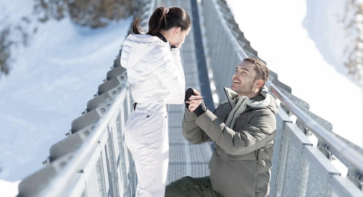En dichas instantáneas, se puede ver que el actor le hizo la propuesta en medio del puente colgante Peak Walk by Tissot de Suiza, teniendo como fondo la vista de unas hermosas montañas llenas de nieve. También se observa a las celebridades vestidas con trajes de esquí.