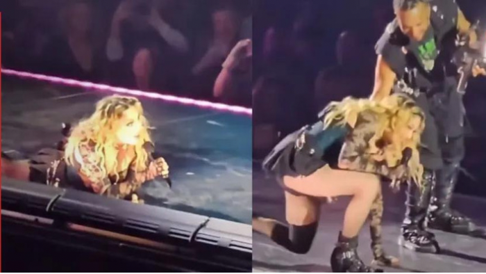 En un video compartido en redes sociales, se puede observar a Madonna sentada en la silla, la cual su bailarín inclina hacia atrás, pero pierde el control y envía a la cantante directamente al suelo, sorprendiendo a la multitud.