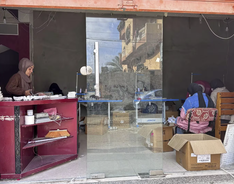 Una veintena de desplazados palestinos se afanan en un pequeño taller de Rafah, sur de Gaza, en la fabricación de pañales hechos a mano, a fin de hacer frente a la escasez y a los precios abusivos que ha alcanzado este producto básico debido a la guerra, el cerco y el perenne bloqueo israelí.