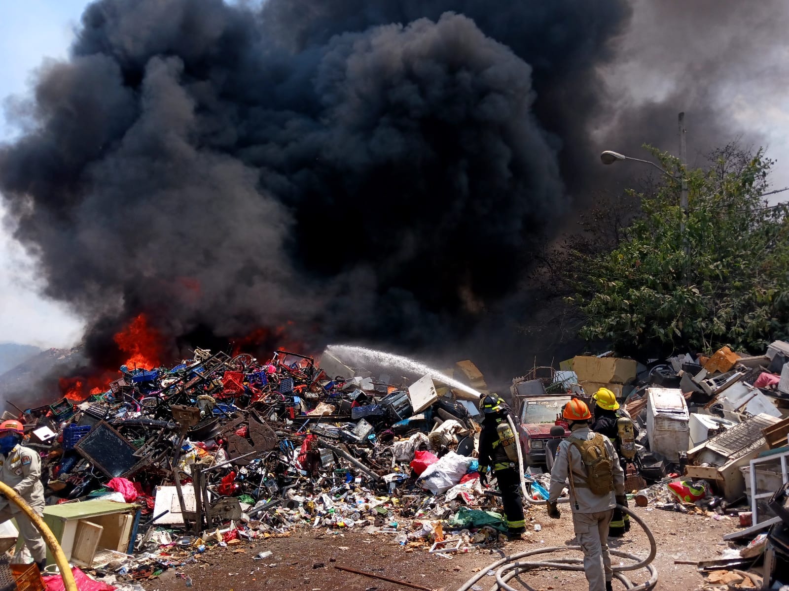 Cuerpo de bomberos trabaja en sofocar un fuerte incendio que se produjo este domingo en una chatarrera ubicada en la zona 8 de la colonia Cerro Grande de Comayagüela.