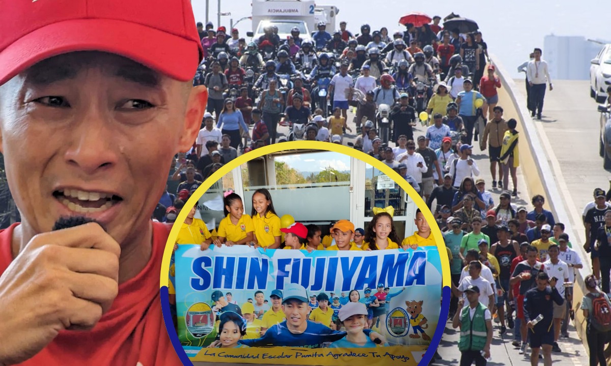 Fujiyama en su trayecto fue recibido con mucho cariño por centenares de personas, incluyendo los alumnos del centro escolar aplaudiendo y gritando su nombre.