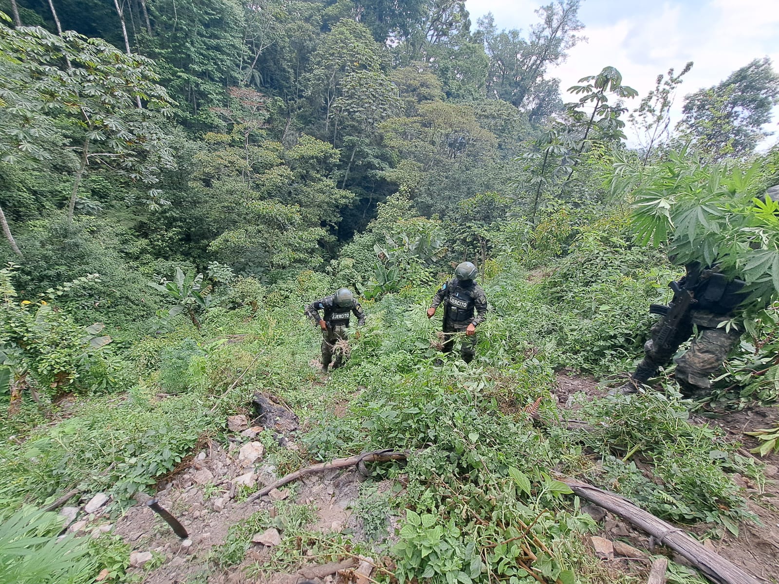 Las FF.AA, a través de equipos de la Dirección de Información Estratégica, Ejército y PMOP, el 24 de abril del 2024, en el sector del Parque Nacional Montaña de Yoro, departamento Yoro, efectuó el aseguramiento de una plantación de una manzana de tierra, conteniendo aproximadamente (5,000) plantas de supuesta marihuana.