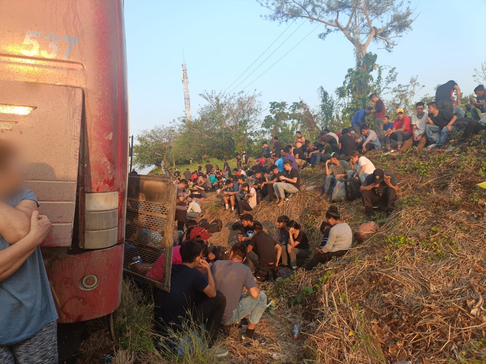 Elementos de seguridad del orden federal y estatal ubicaron en la autopista Minatitlán-Acayucan, en Veracruz, tres autobuses de turismo, en los cuales se identificó a 407 personas extranjeras abandonadas que no acreditaron su estancia regular en territorio mexicano.