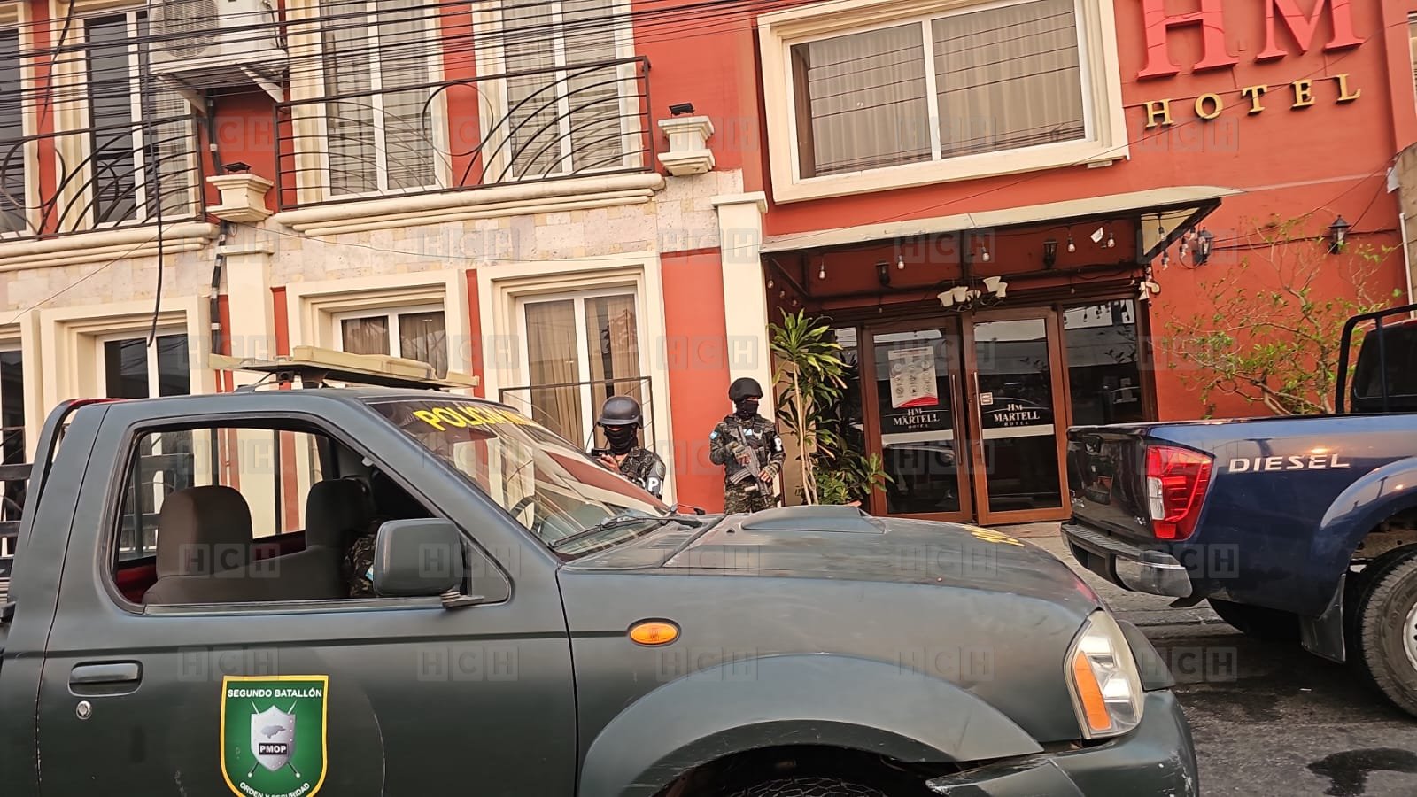 Agentes policiales realizan allanamiento en el Hotel Martell, en el barrio Suyapa de San Pedro Sula, donde por el momento, no se han registrado detenciones.