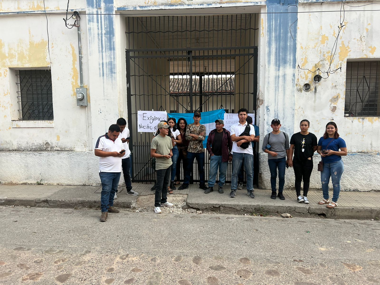 Encuestadores contratados por el Instituto Nacional de Estadística (INE) protestan frente a la oficina de Gobernación de Gracias, Lempira, exigiendo que les hagan efectivo el pago de un mes de salario.