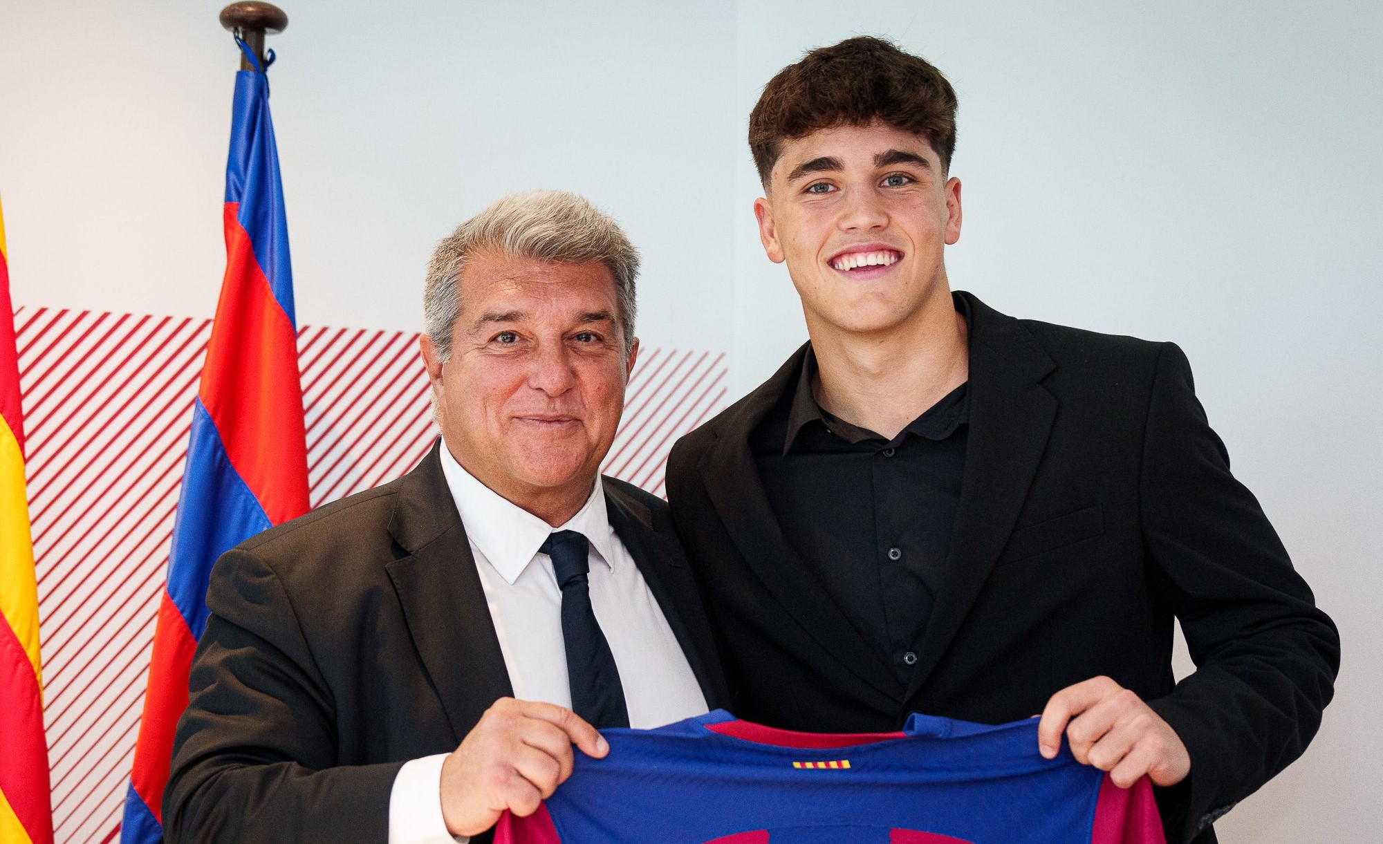 El defensa azulgrana firmó su nuevo contrato este jueves por la mañana en un acto en el que estaban el presidente del Barcelona, Joan Laporta; el vicepresidente primero, Rafa Yuste; el directivo responsable del Fútbol Formativo, Joan Soler; y el director deportivo Deco.
