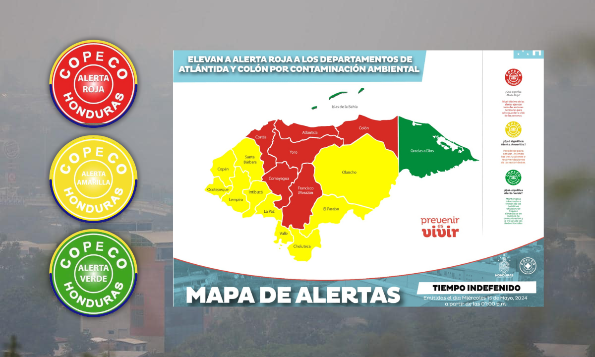 Por múltiples casos de afectaciones en la salud de las personas, altos niveles de contaminación atmosférica, mala calidad del aire que provoca la densa capa de humo con altas temperaturas, así como los incendios forestales y la ausencia necesarias para de lluvias, la Secretaría de Estado en los Despachos de Gestión de Riesgos Contingencias Nacionales (COPECO), suma a Alerta Roja a los departamentos de Atlántida y Colón, que junto a los departamentos de Francisco Morazán, Comayagua, Cortés y Yoro, permanecerán en ese nivel máximo.