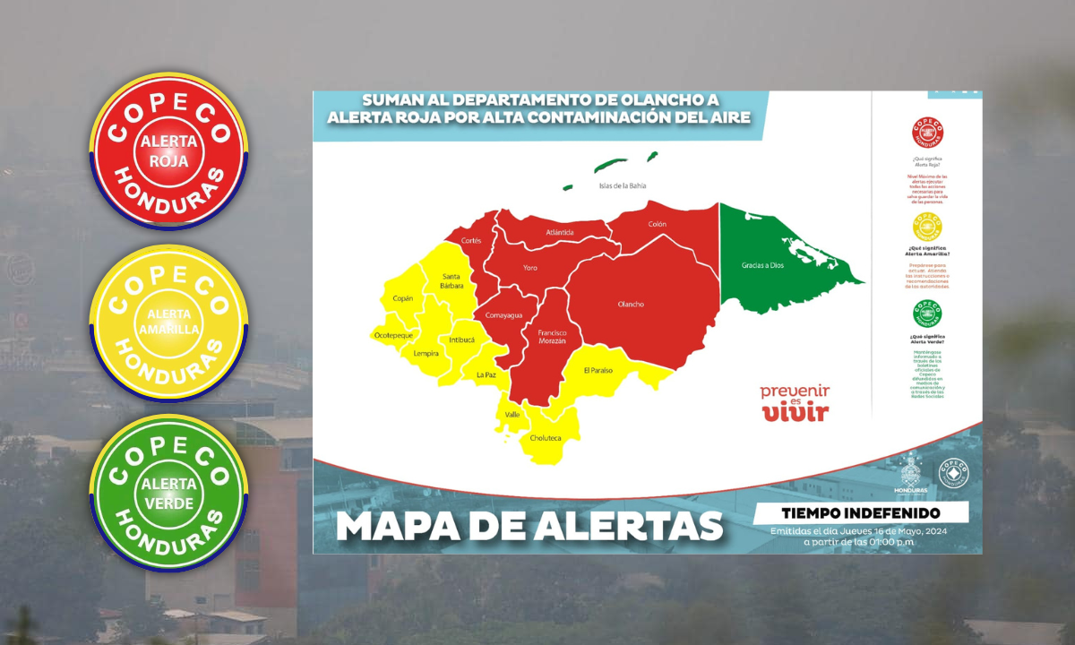 Por múltiples casos de afectaciones en la salud de las personas, altos niveles de contaminación atmosférica, mala calidad del aire que provoca la densa capa de humo con altas temperaturas, así como los incendios forestales y la ausencia de lluvias, la Secretaría de Estado en los Despachos de Gestión de Riesgos y Contingencias Nacionales (COPECO), eleva a Alerta Roja al departamento de Olancho, que junto a los departamentos de Atlántida, Colón, Francisco Morazán, Comayagua, Cortés y Yoro, permanecerán en ese nivel máximo.