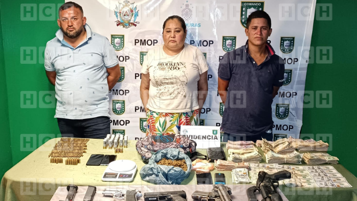 Tres personas fueron detenidas este sábado en posesión de más de 300 mil lempiras, varias bolsas que contenían drogas y seis armas de fuego en el municipio de Nueva Arcadia, Copán.