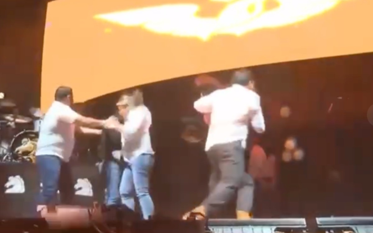 En un vídeo difundido por Foro TV se observa el momento exacto en el que una pantalla gigante empieza a desprenderse por las ráfagas de viento, lo que obliga a los presentes a salir corriendo para ponerse a salvo.