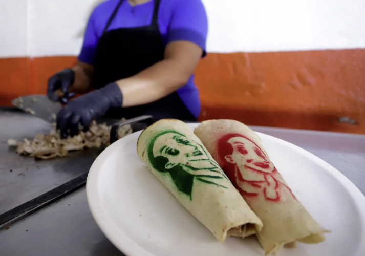 Para este taco, en las blancas tortillas de harina, se pinta la imagen de la próxima presidenta de México, Claudia Sheinbaum, con un dibujo animado de su imagen en colores rojo y verde de pinturas vegetales, que representan los colores de la bandera mexicana.