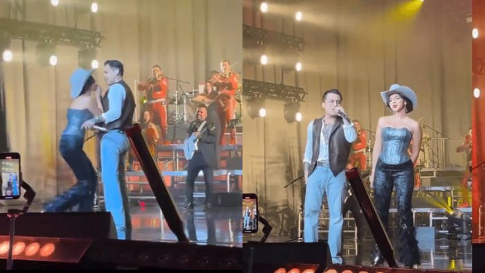 La intérprete de ‘Qué agonía’ salió al escenario para cantar junto a Nodal uno de los mayores éxitos de su padre, ‘Por mujeres como tú’, y se dieron el tiempo de cantar su popular y ahora polémico sencillo ‘Dime cómo quieres’.