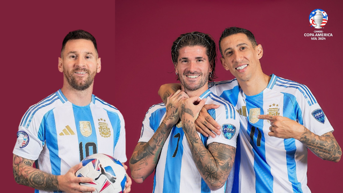La cita fue dando a conocer las poses de cada uno de los futbolistas elegidos por el Gringo Scaloni. Por ejemplo, la de Rodrigo de Paul besando un mini trofeo de la Copa América. O de Julián Álvarez señalándose el logo de la competencia. También hubo combinadas. Del mediocampista del Atlético de Madrid con Ángel Di María. Y del propio Fideo con Messi.
