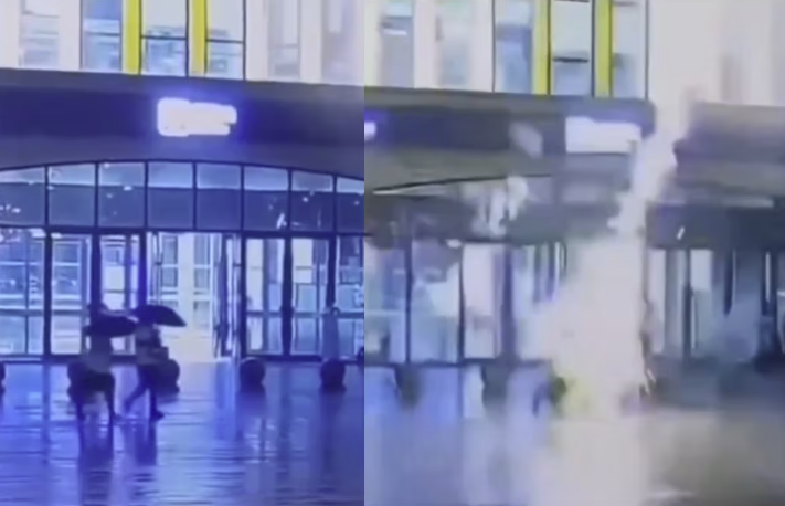 Los hechos tuvieron lugar en la estación de tren Jinzhou norte. Cámaras de seguridad de la terminal captaron cómo la descarga eléctrica cayó sobre los paraguas que los afectados sostenían para protegerse de la lluvia. Estas personas terminaron en el suelo tras el impacto.