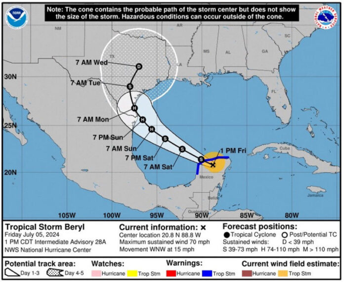 El núcleo de Beryl, un huracán que alcanzó la máxima categoría de 5 en el Caribe, tocó tierra la madrugada del viernes cerca de Tulum y, según un probable patrón de trayectoria, la costa de Texas está expuesta a su embate.
