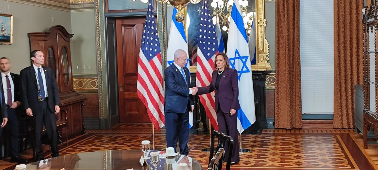 Harris recibió este jueves al primer ministro israelí, Benjamín Netanyahu, con un breve saludo antes de mantener una reunión privada sobre las negociaciones para la liberación de rehenes y un alto el fuego en Gaza.