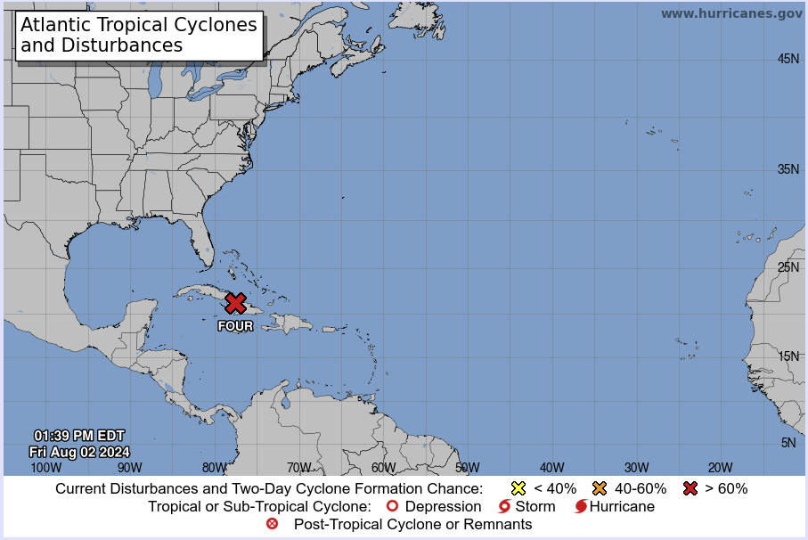 El Centro Nacional de Huracanes (CNH) anunció el viernes 2 de agosto que se había formado el posible ciclón tropical cuatro sobre Cuba, emitiendo vigilancias y avisos de tormenta tropical para varias zonas de Florida.