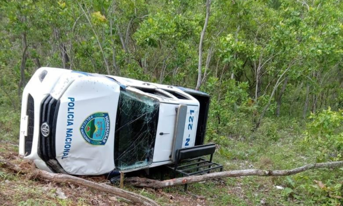 Se reporta un accidente de tránsito tipo despiste seguido de volcamiento de una patrulla policial que deja daños materiales y varios policías lesionados esto en la carretera que conduce de Aldea El Bijao hacia la ciudad de Juticalpa, Olancho.
