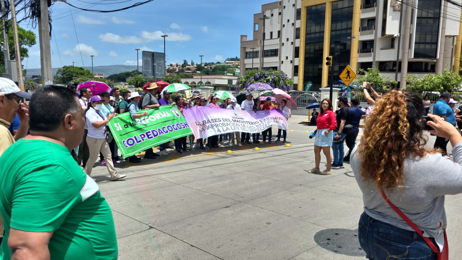 Magisterio realizan plantón y exigen la aprobación de las Reformas a la Ley de Instituto Nacional de Previsión del Magisterio (Inprema), frente a las instalaciones de ese colegio magisterial.