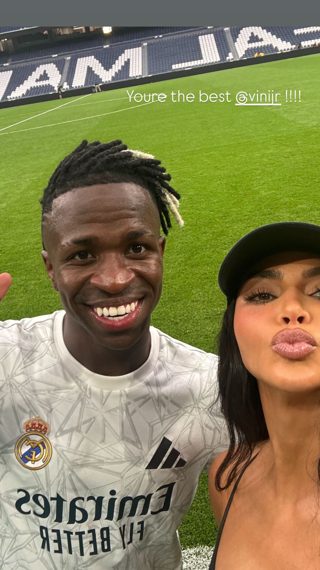 Invitada por Vinicius, Kim Kardashian disfrutó de un momento inolvidable que subió a su cuenta oficial de Instagram cuando su hijo saltó al campo con los titulares del Real Madrid, de la mano de ‘Vini’. Incluso un par de días atrás, la norteamericana estuvo de visita en casa del brasileño.