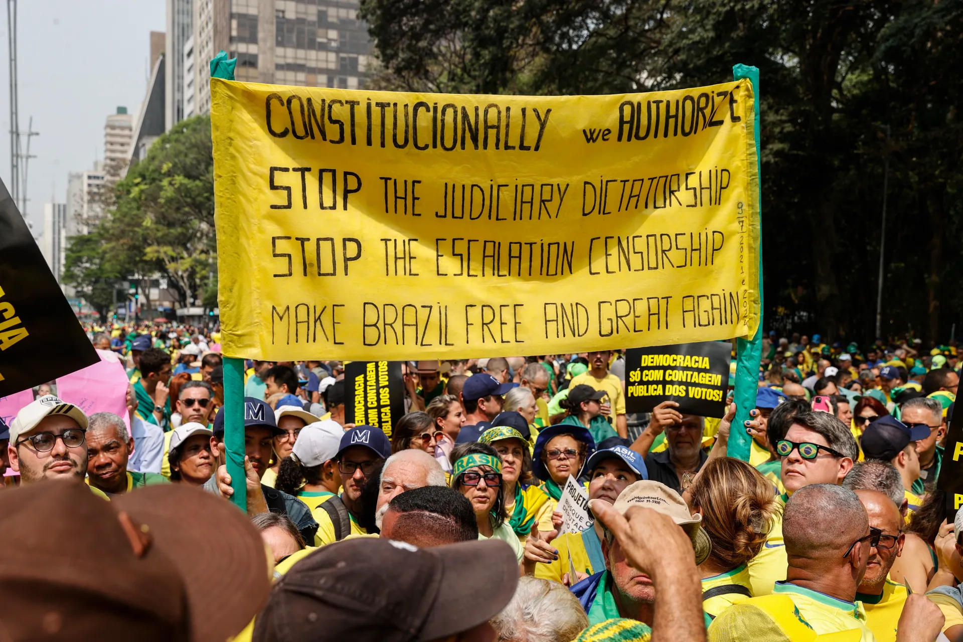 La protesta tiene lugar en la concurrida Avenida Paulista y ha reunido a brasileños de distintas regiones del país, en su mayoría vestidos con los colores verde y amarillo de la bandera nacional y con carteles con proclamas contra el Supremo, coincidiendo con el Día de la Independencia.