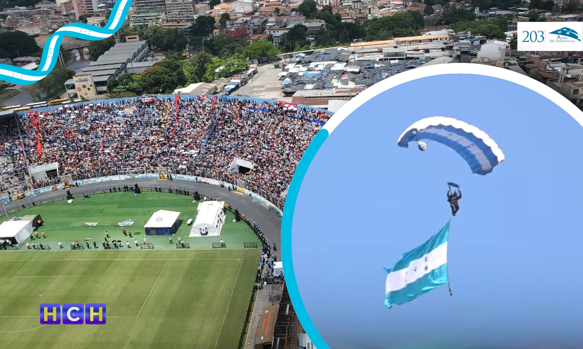 Demostrando sus destrezas, los paracaidistas de la Fuerza Aérea de Honduras realizaron sus tradicionales actos al caer sobre el estadio José de la Paz Herrera, dando un show espectacular durante el 203 aniversario de independencia.