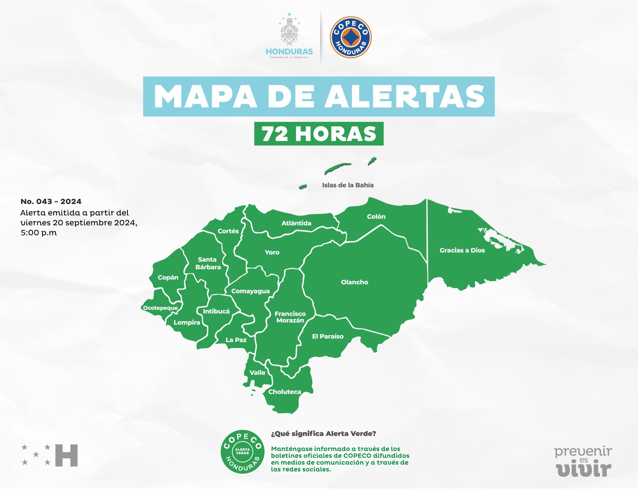 La Secretaría de Estado en los Despachos de Gestión de Riesgos y Contingencias Nacionales (COPECO), declara Alerta Verde en todo el territorio nacional por un período de 72 horas a partir de las 5:00 de la tarde de este viernes 20 de septiembre 2024.