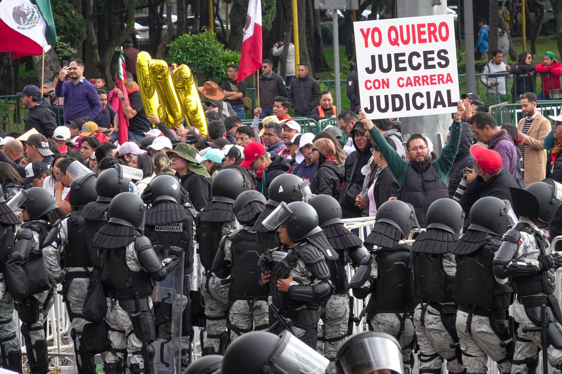 Un grupo de manifestantes se congregó en la avenida Congreso de la Unión, donde gritaban consignas como: “¡Señor, señora, no sea indiferente, México requiere justicia independiente!”, portando pancartas que los identificaban como miembros de diferentes circuitos judiciales.