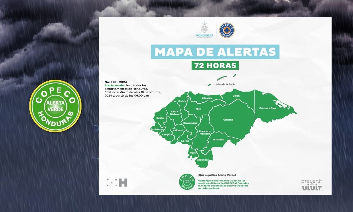 A través de un comunicado, la Comisión Permanente de Contingencias (Copeco), informó que se ha declarado alerta verde a nivel nacional por 72 horas, esto debido a un sistema de presión que se encuentra ubicado cerca del departamento de Gracias a Dios, generando lluvias y chubascos con actividad electrica.