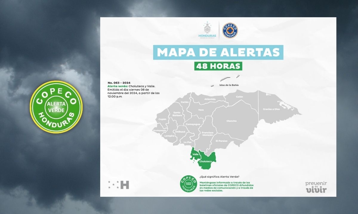 A través de un comunicado, la Comisión Permanente de Contingencias (Copeco) ha informado este viernes que se extiende la Alerta Verde por 48 horas más para los departamentos de Choluteca y Valle, por efectos indirectos del Huracán Rafael.