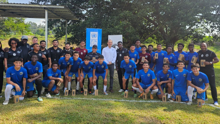 El delantero hondureño Alberth Elis y el representante residente del Programa de las Naciones Unidas para el Desarrollo (PNUD), Richard Barathe, firmaron una carta de intención con la presencia de los jóvenes del club Panteras FC que forma parte de la Liga Mayor en tercera división.