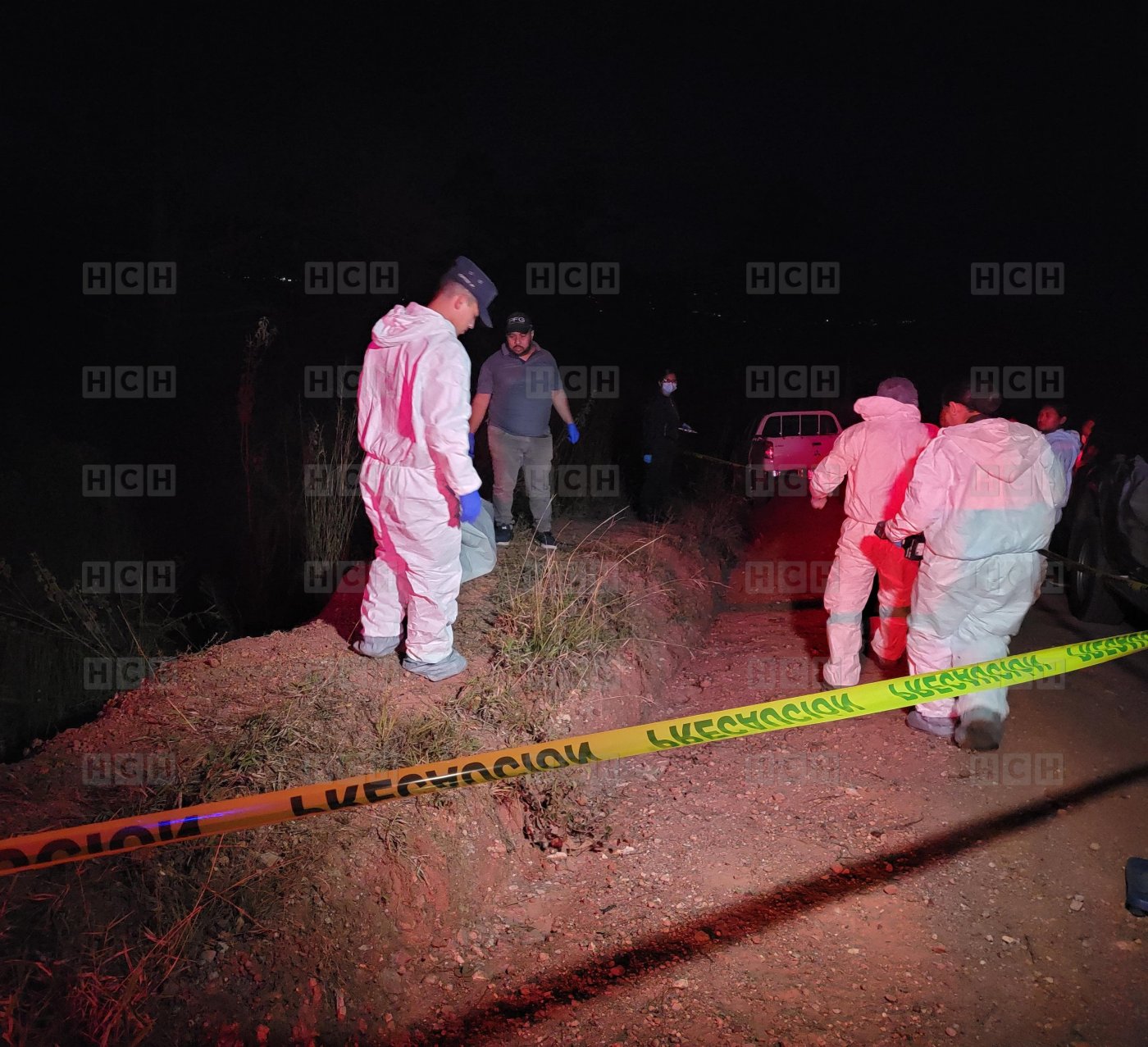 Al acercarse a una pequeña hondonada a la orilla de la polvorienta calle, se observó el cuerpo de un hombre a quien le colocaron la mitad de un caso rojo en su cuerpo, estaba maniatado y solamente vestía una calzoneta color azul., su cuerpo completamente descompuesto y su rostro ya desfigurado por los carroñeros.