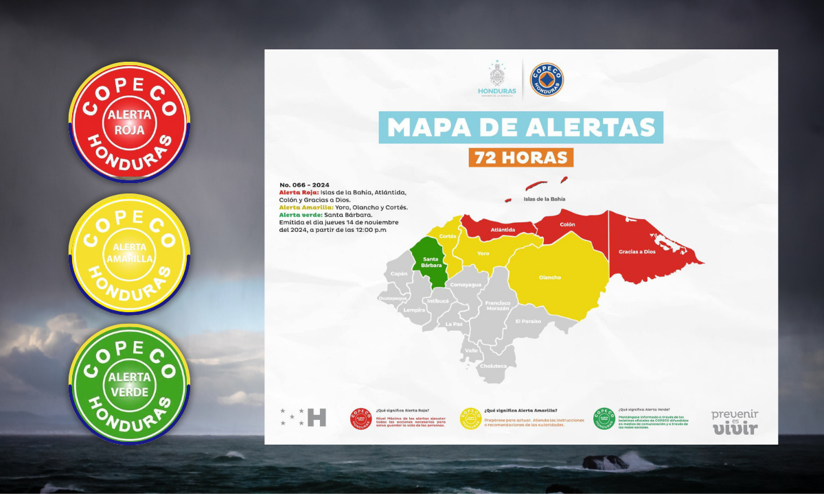 Asimismo, se informó la alerta amarilla en los departamentos de Yoro, Olancho y Cortés, mientras que, Santa Bárbara se mantiene en alerta verde.