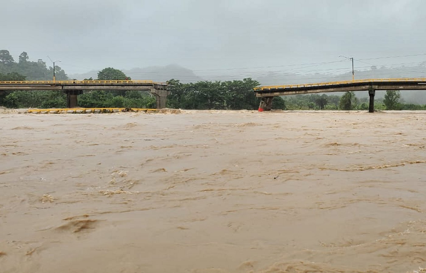 Debido a las condiciones climatológicos que azotan la ciudad de La Ceiba, este viernes se ha reportado la caída del puente Saopín, mismo cedió ante las fuertes corrientes del río Cangrejal.