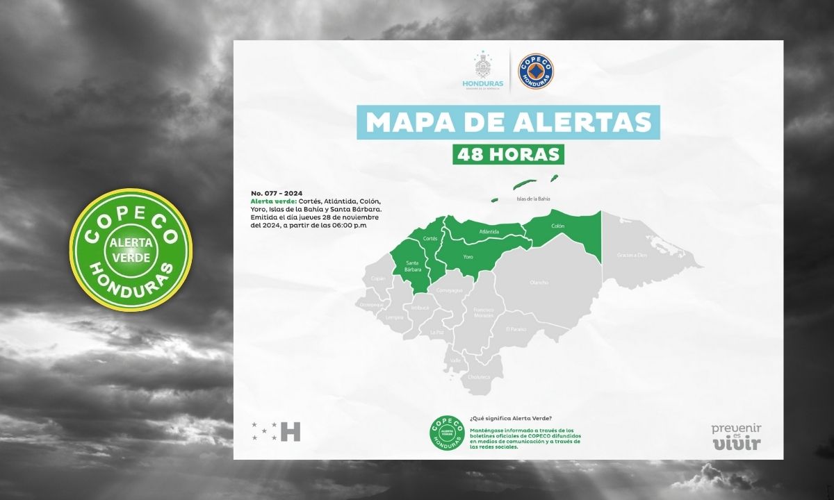 La Secretaría de Estado en los Despachos de Gestión de Riesgos y Contingencias Nacionales (COPECO) declara Alerta Verde para los departamentos de Cortés, Atlántida, Islas de la Bahía, Colón, Yoro y Santa Bárbara, por un período de 48 horas a partir de las 6 de la tarde de hoy, jueves 28 de noviembre.