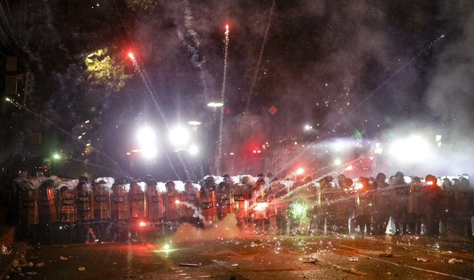Tras varios días de protestas pacíficas frente al Parlamento georgiano, los manifestantes iniciaron enfrentamientos físicos contra las fuerzas del orden y llegaron a lanzar artefactos de pirotecnia. La policía empleó cañones de agua para expulsar a la multitud del edificio gubernamental.
