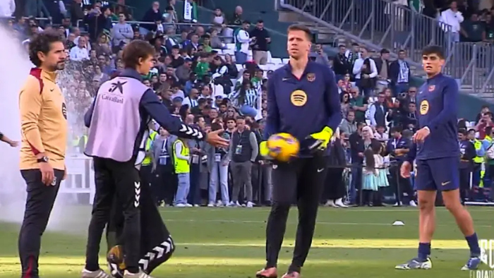 Antes de que arrancara el encuentro, Raphinha practicó sus tiros libres, pero en un momento dado el recogepelotas del Betis encargado de llevarse los balones se topó en su camino y el futbolista y su compañero Szczesny terminaron vacilándole.