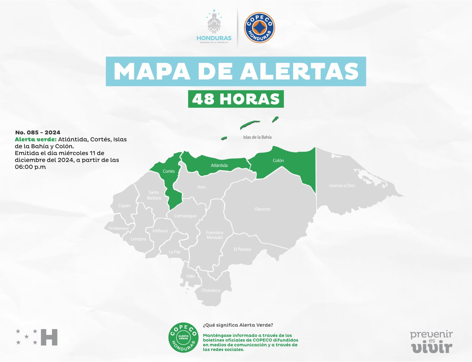 La Secretaría de Estado en los Despachos de Gestión de Riesgos y Contingencias Nacionales (COPECO) declara Alerta Verde en los departamentos de Cortés, Atlántida, Colón e Islas de la Bahía, por 48 horas a partir de las 6 de la tarde de hoy, miércoles 11 de diciembre, por lluvias.