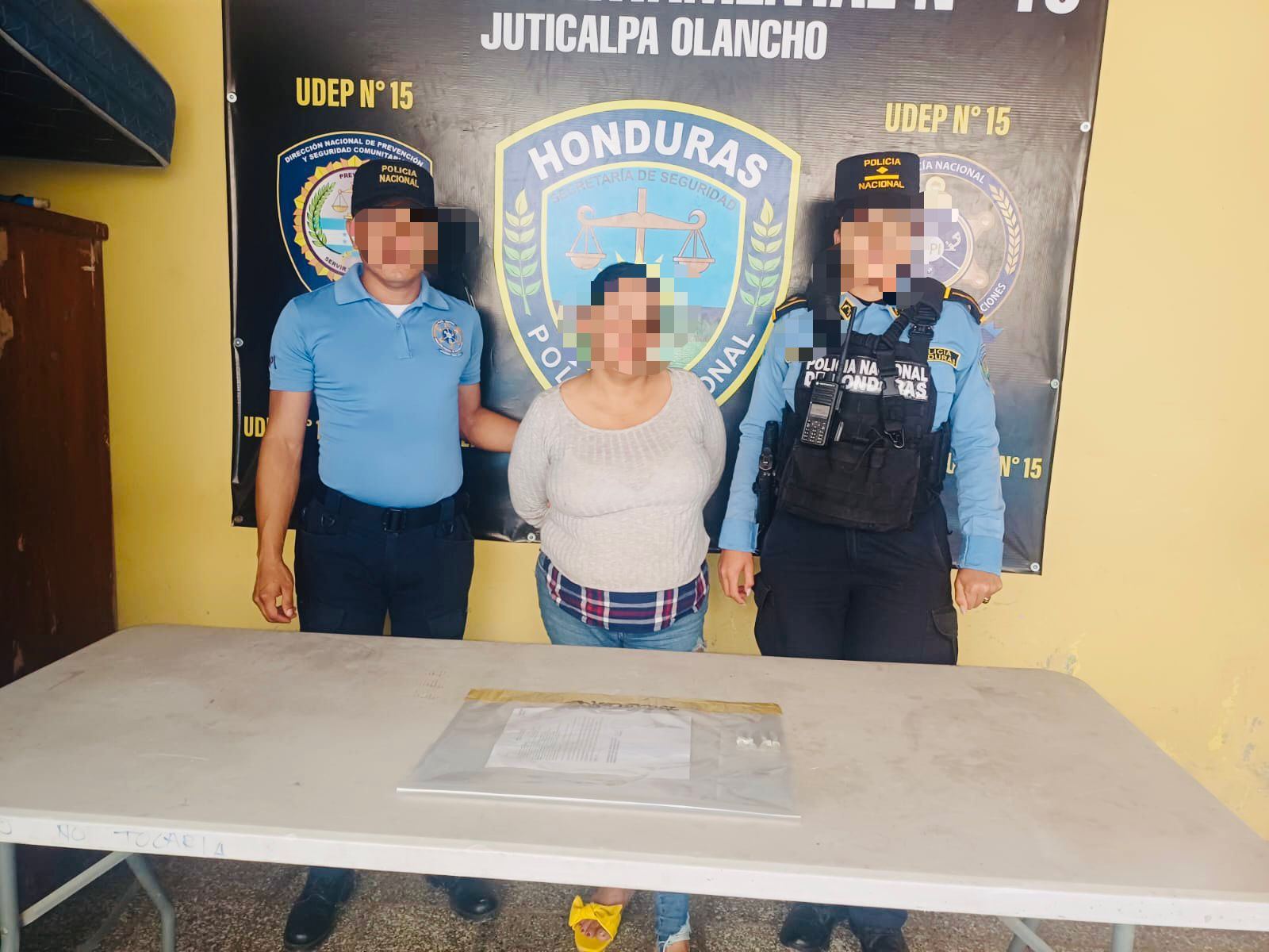 Se trata de una mujer de 38 años, originaria de la colonia Altos de Santa Ana, del municipio de Juticalpa, departamento de Olancho. Al momento del arresto se le encontró en posesión de cuatro envoltorios con polvo blanco, supuesta cocaína.