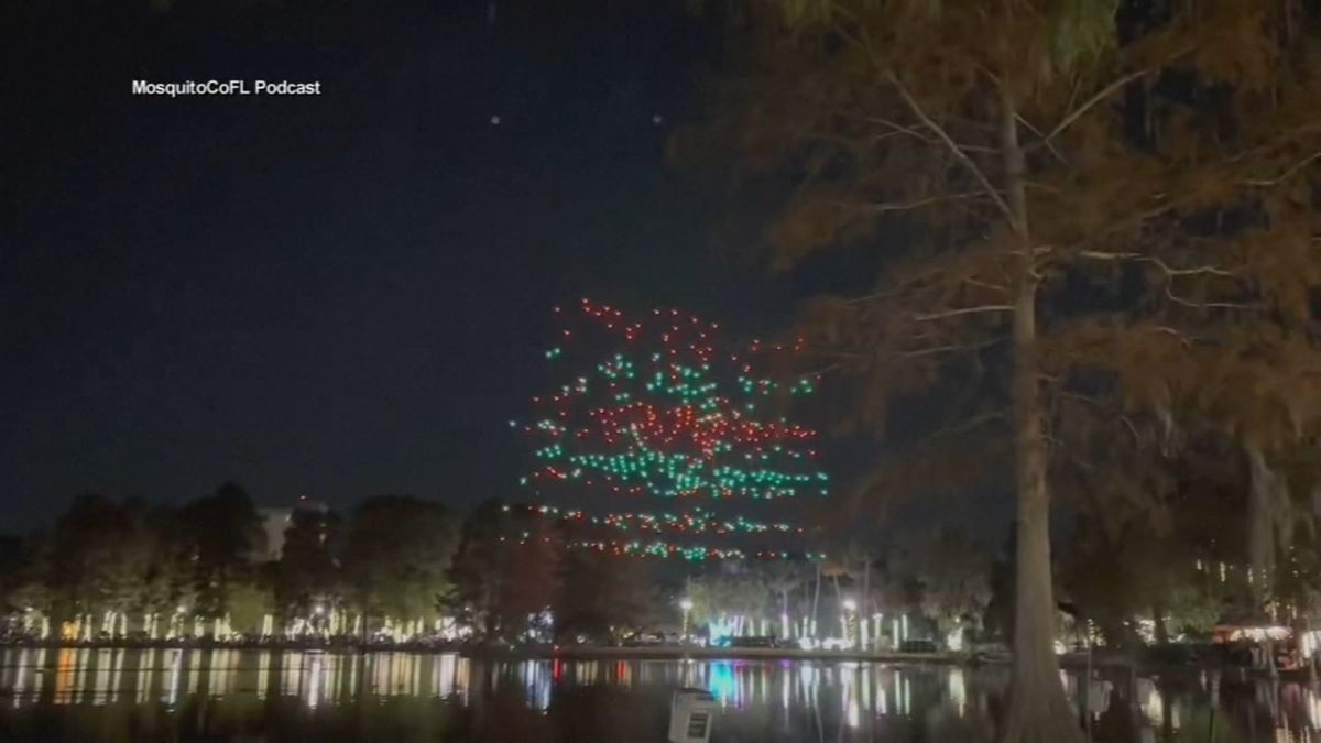 Los videos compartidos por los espectadores del evento en el Parque Lake Eola de Orlando muestran docenas de drones iluminados volando en sincronía, formando figuras con temas navideños como cisnes, palomas, Papá Noel y regalos.
