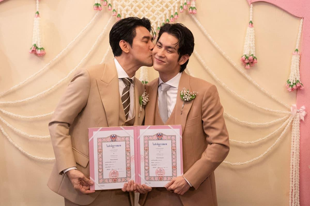 Los actores Apiwat «Porsch» Apiwatsayree, de 49 años, y Sappanyoo «Arm» Panatkool, de 38, llegaron vestidos con trajes beige a la oficina de registro de Bangkok, donde recibieron su certificado de matrimonio.