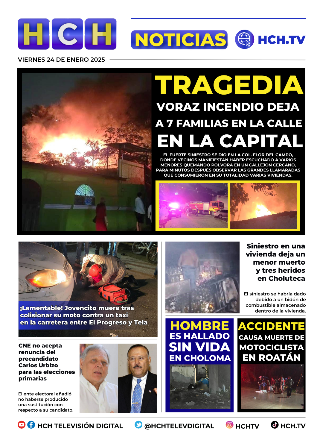 © 2025 - HCH Televisión Digital - Noticias de Honduras y el Mundo. Anillo Periférico, Complejo Empresarial Tegucigalpa, Honduras, C.A. Tel: (504) 2235-3245 / 2235-3246 / 2235-4875 / 2235-4876 LLÁMENOS GRATIS DESDE EE.UU: 3052801682 y 3052801735 © Copyright 2025 - HCH Televisión Digital. Todos nuestros contenidos están protegidos con derechos de autor.
