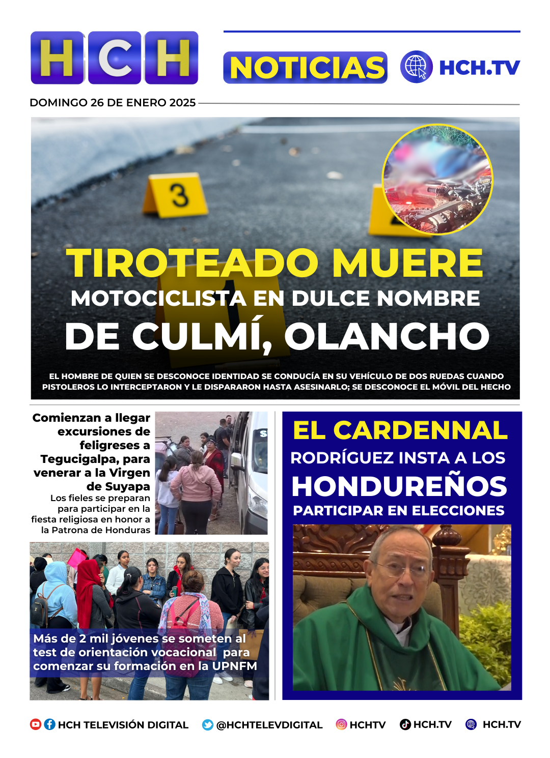 © 2025 - HCH Televisión Digital - Noticias de Honduras y el Mundo. Anillo Periférico, Complejo Empresarial Tegucigalpa, Honduras, C.A. Tel: (504) 2235-3245 / 2235-3246 / 2235-4875 / 2235-4876 LLÁMENOS GRATIS DESDE EE.UU: 3052801682 y 3052801735 © Copyright 2025 - HCH Televisión Digital. Todos nuestros contenidos están protegidos con derechos de autor.